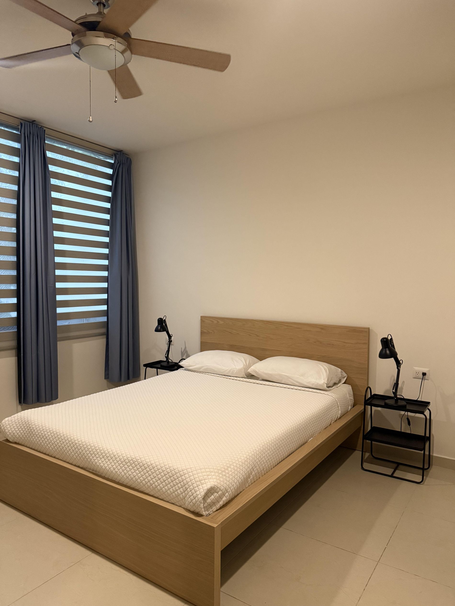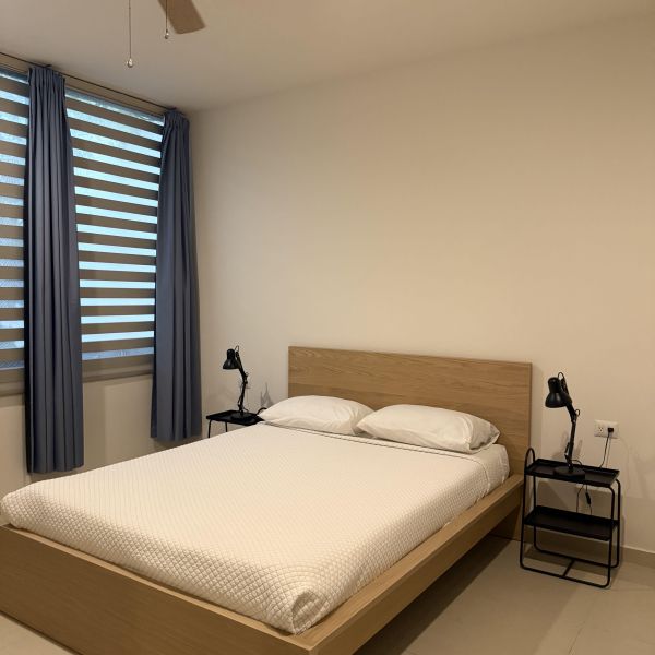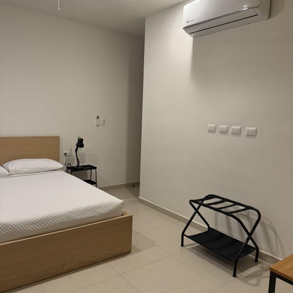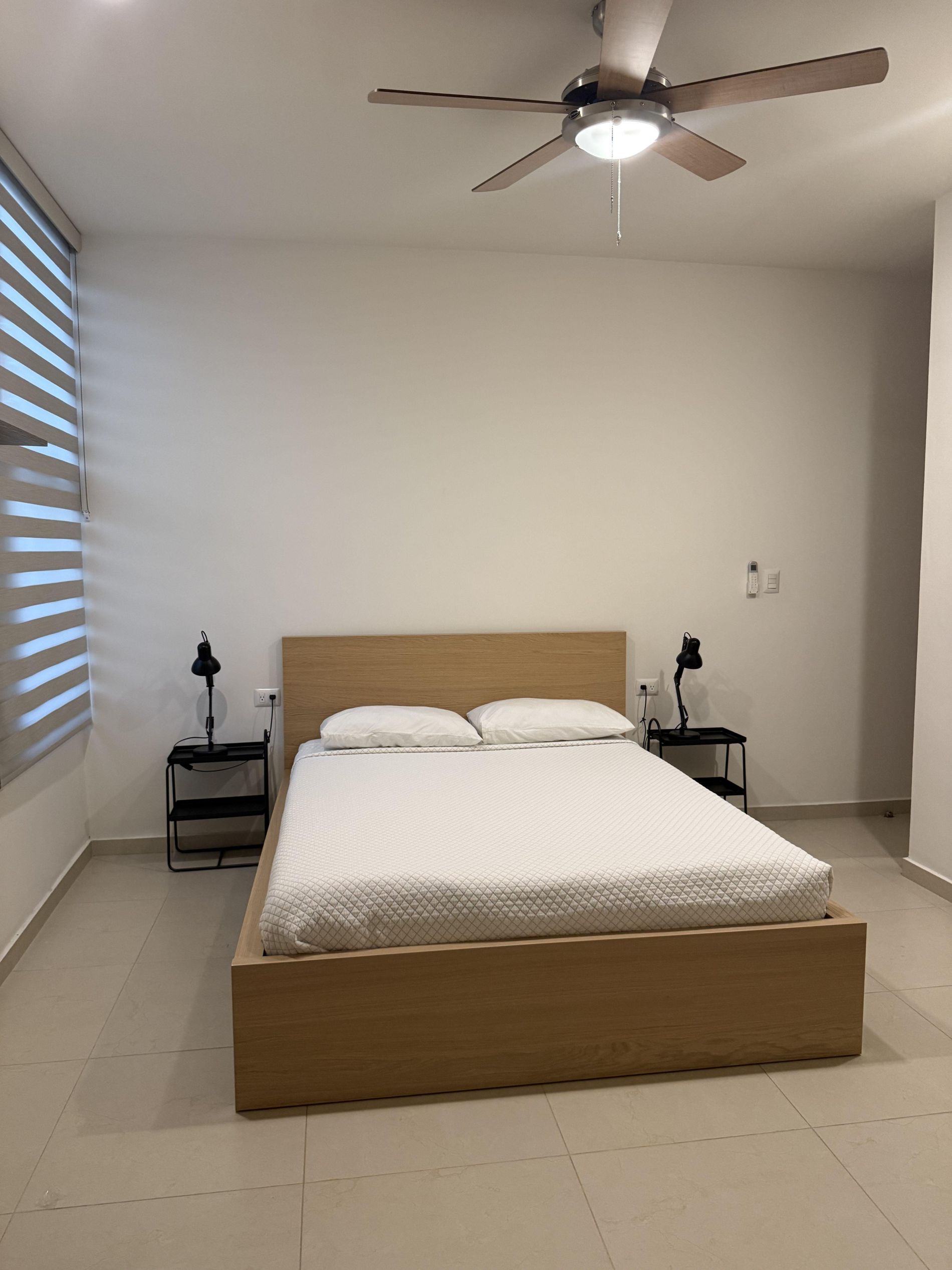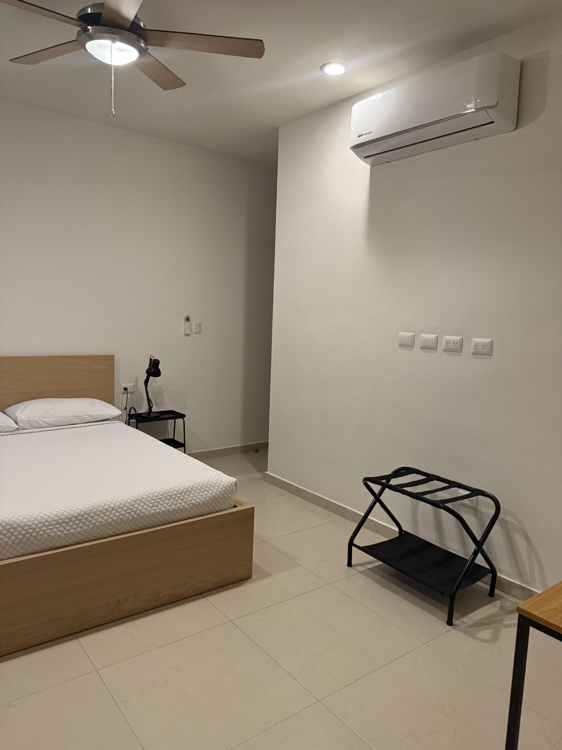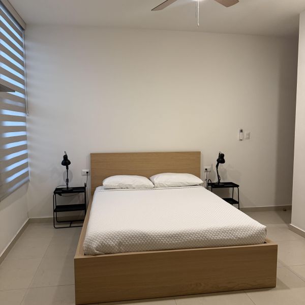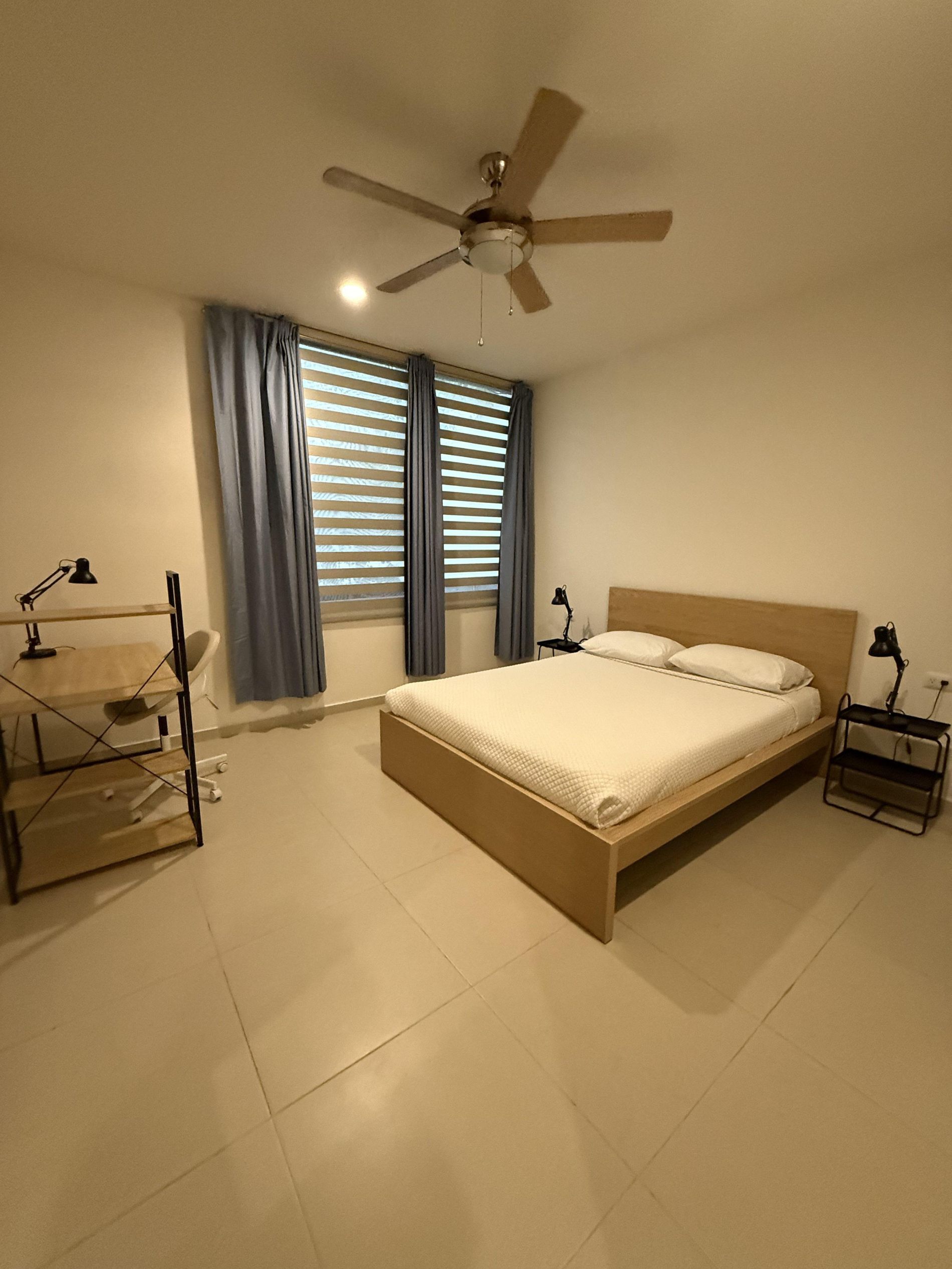 Recámara secundaria con cama matrimonial, escritorio y baño completo.