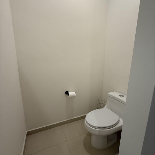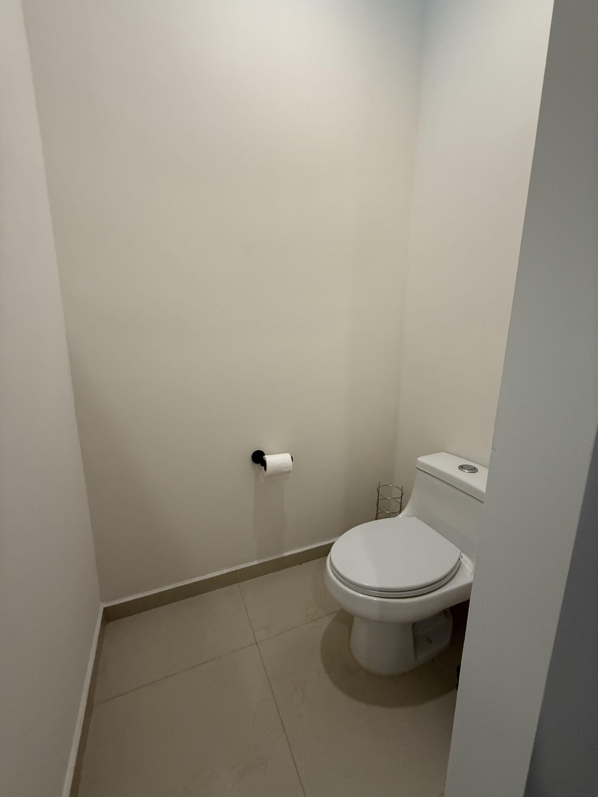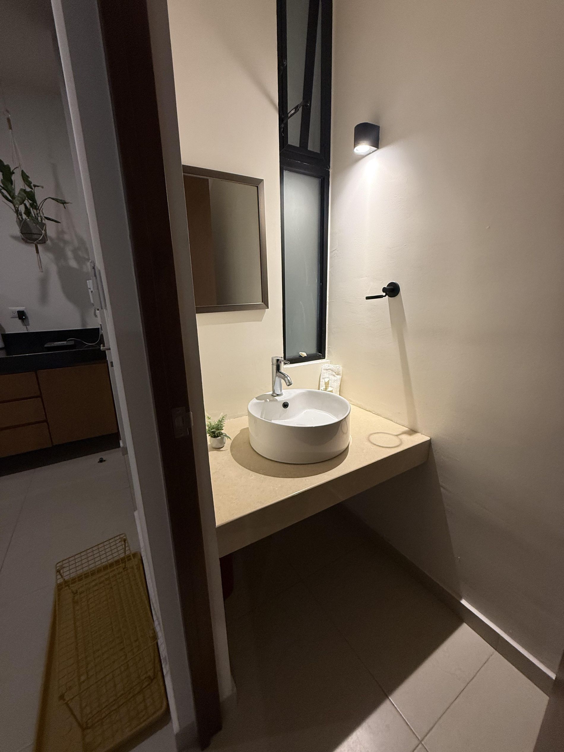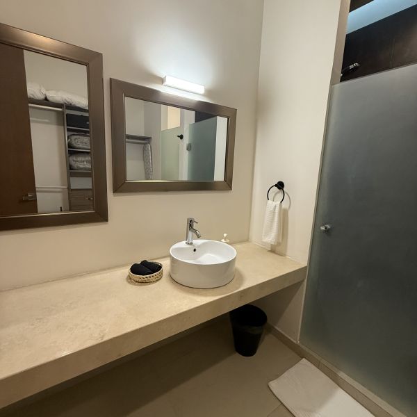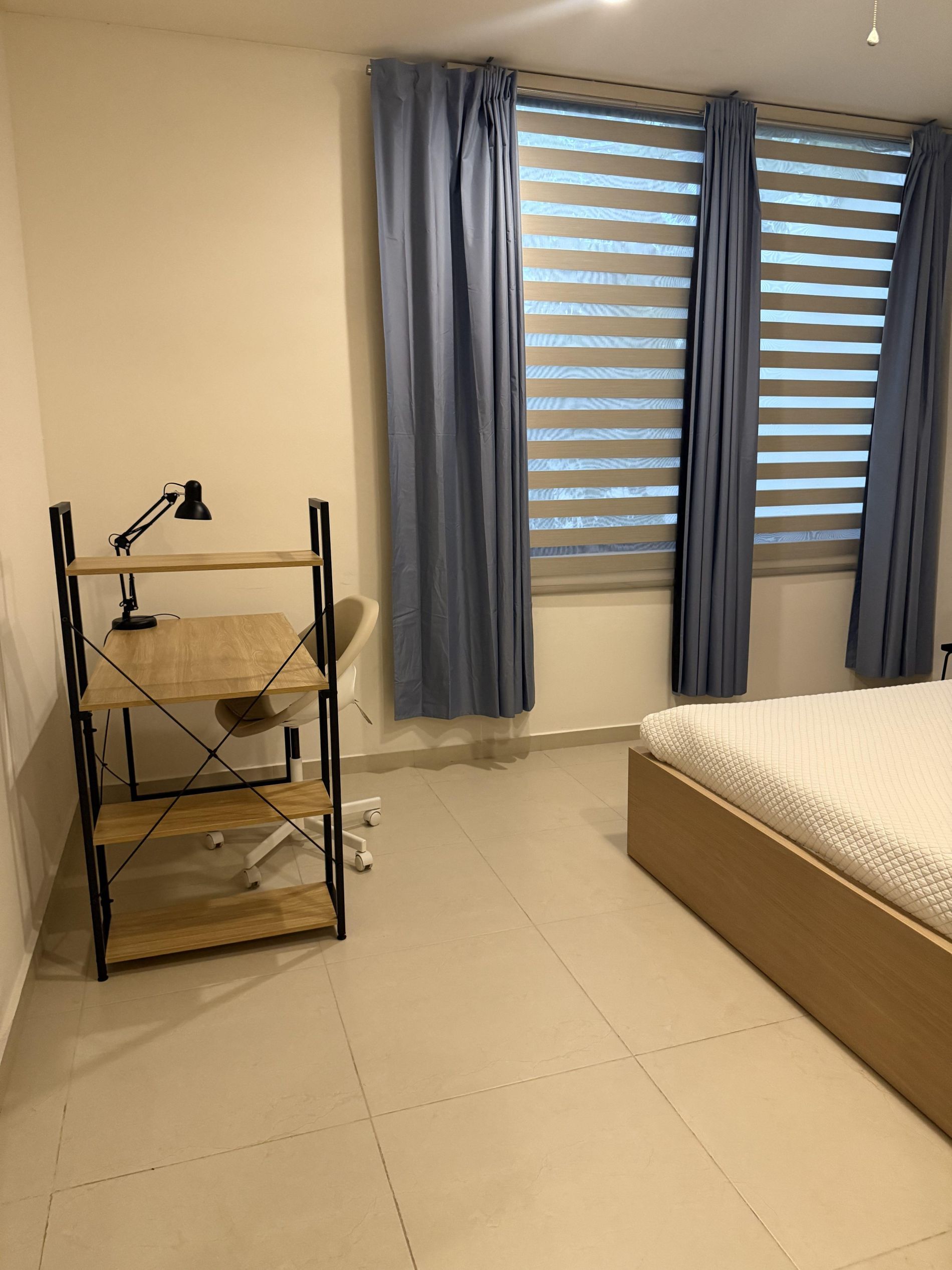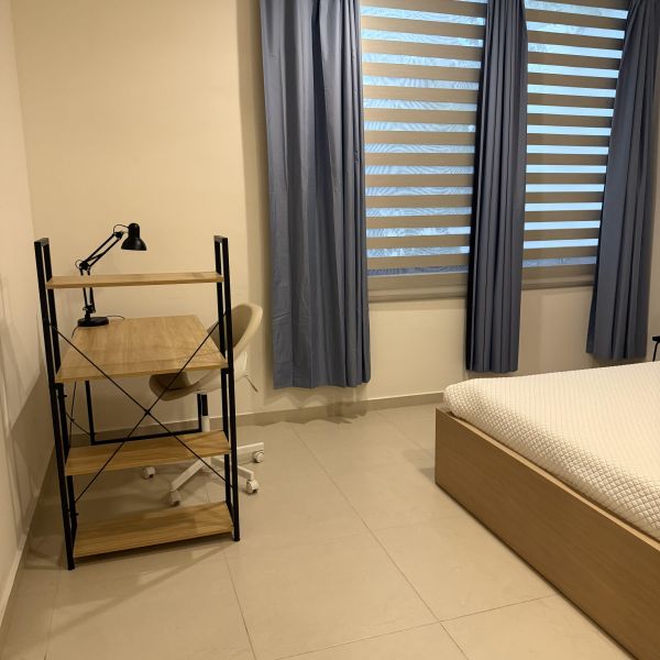 Recámara secundaria con cama matrimonial, escritorio y baño completo.
