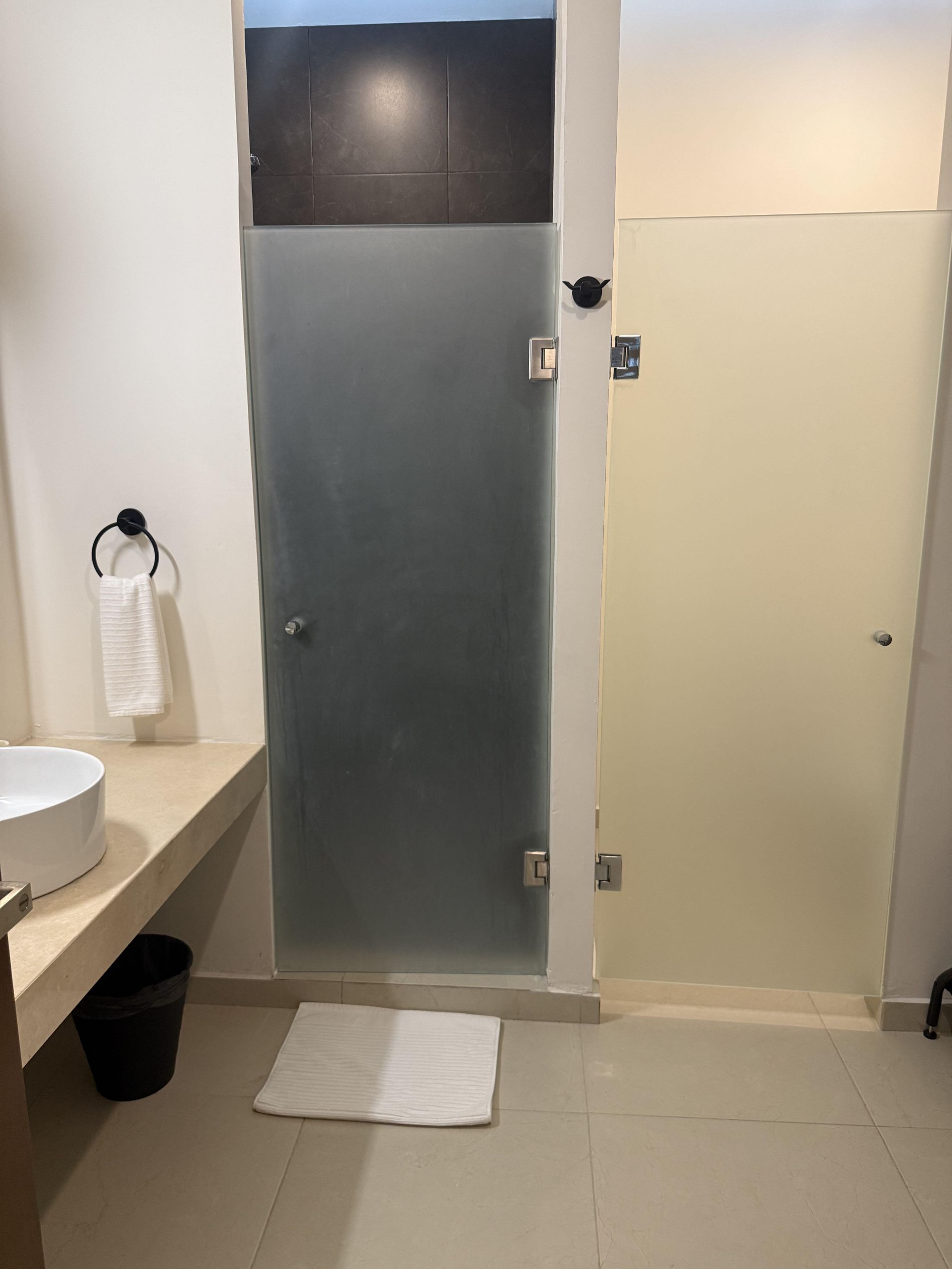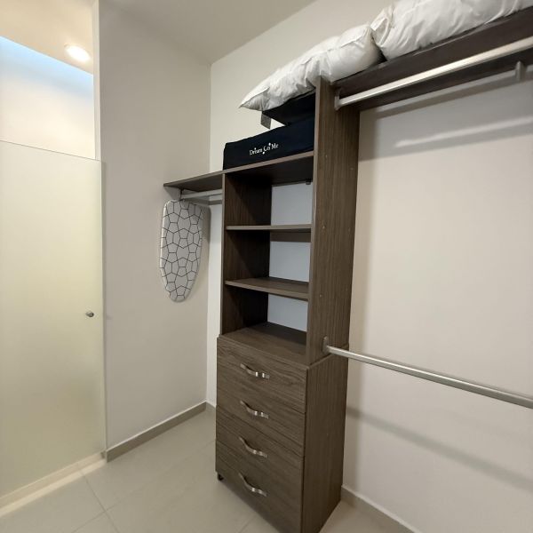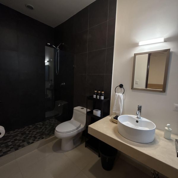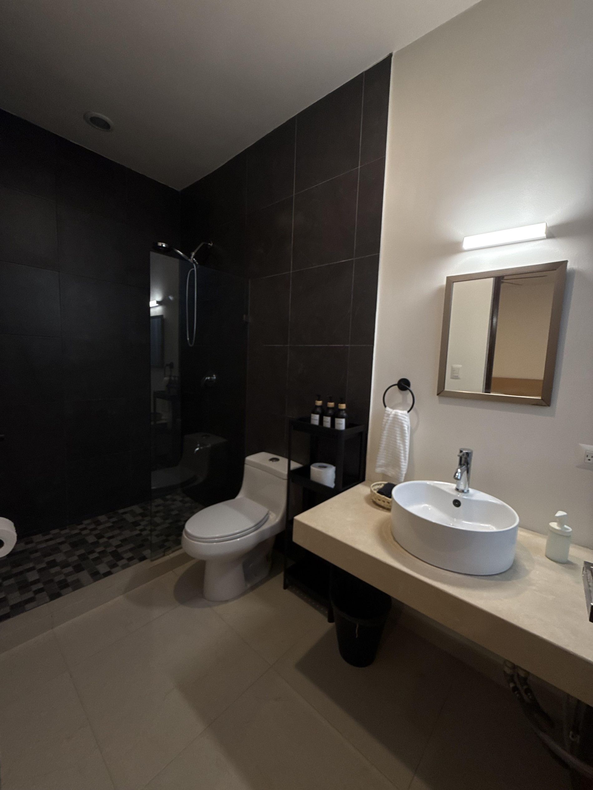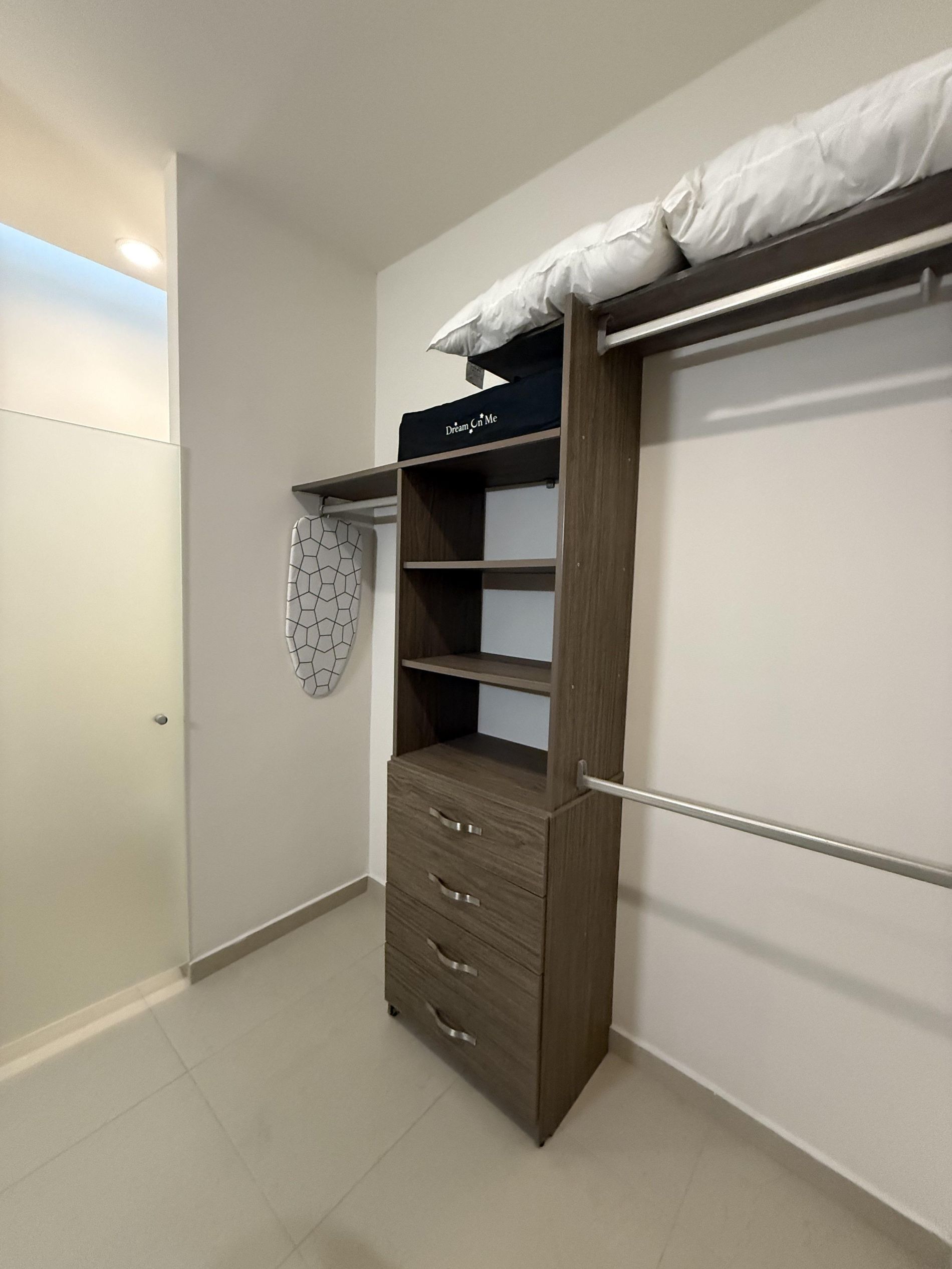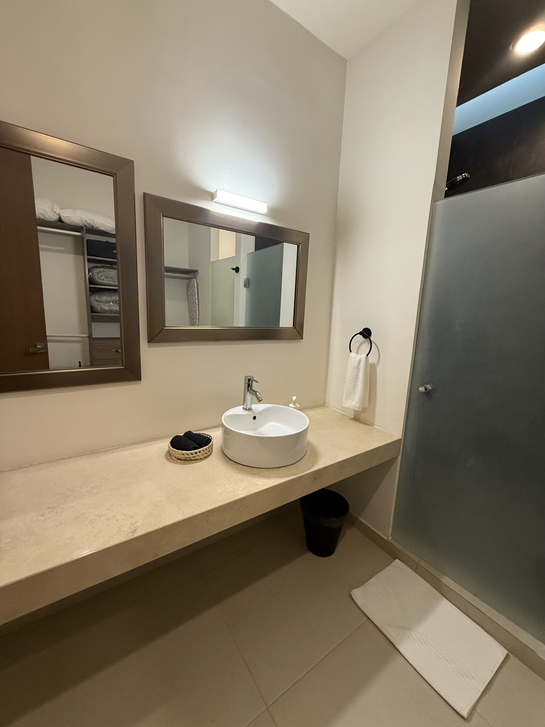 Recámara secundaria con cama matrimonial, escritorio y baño completo.
