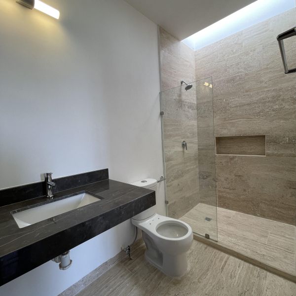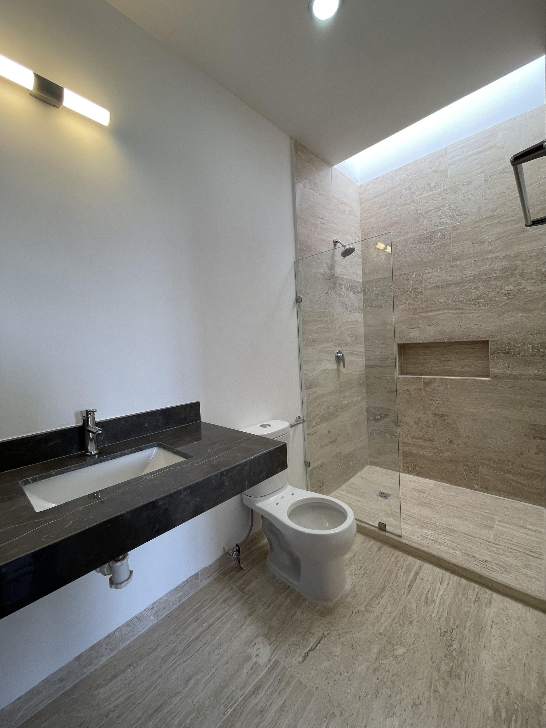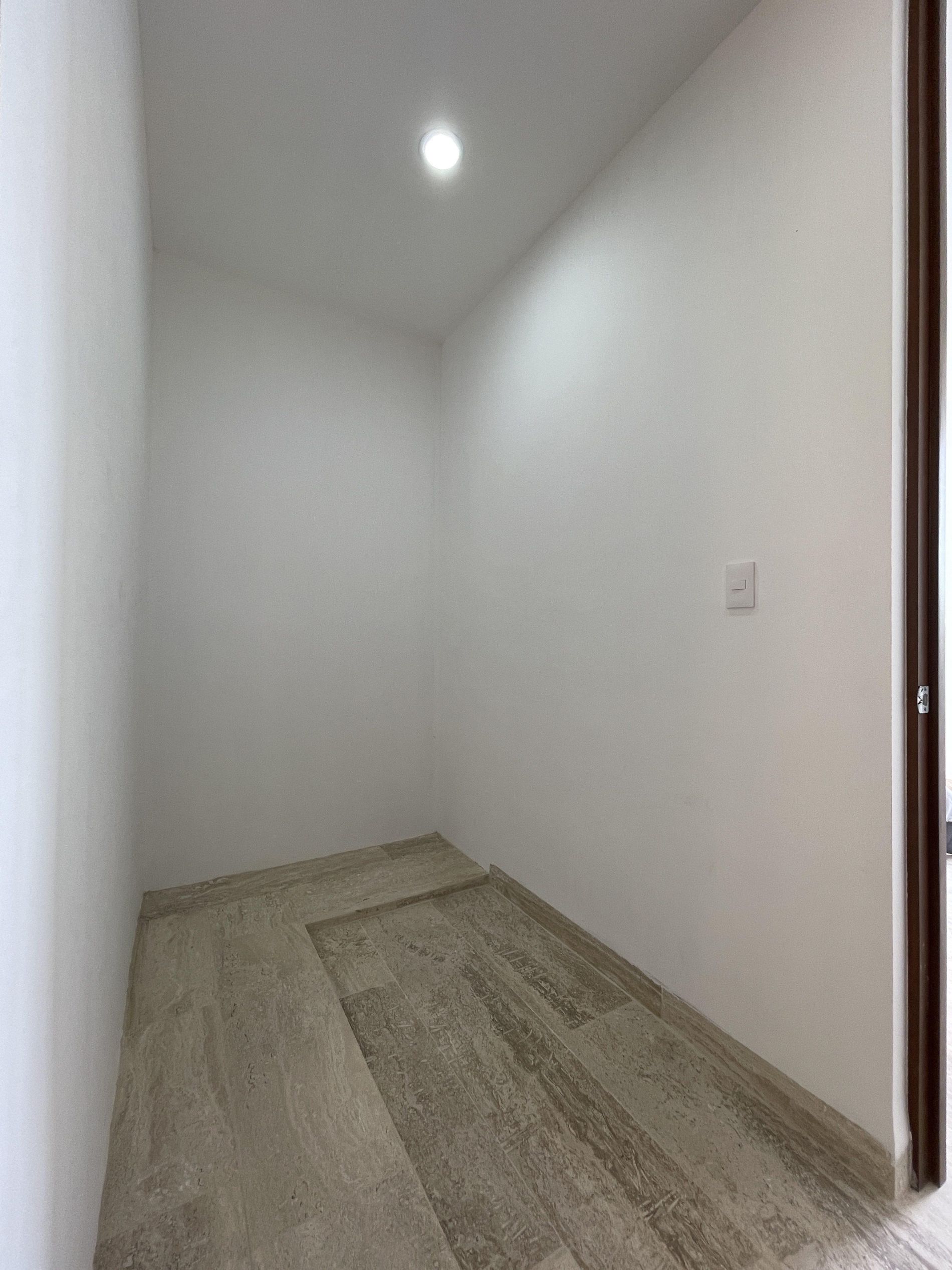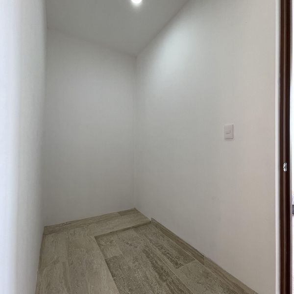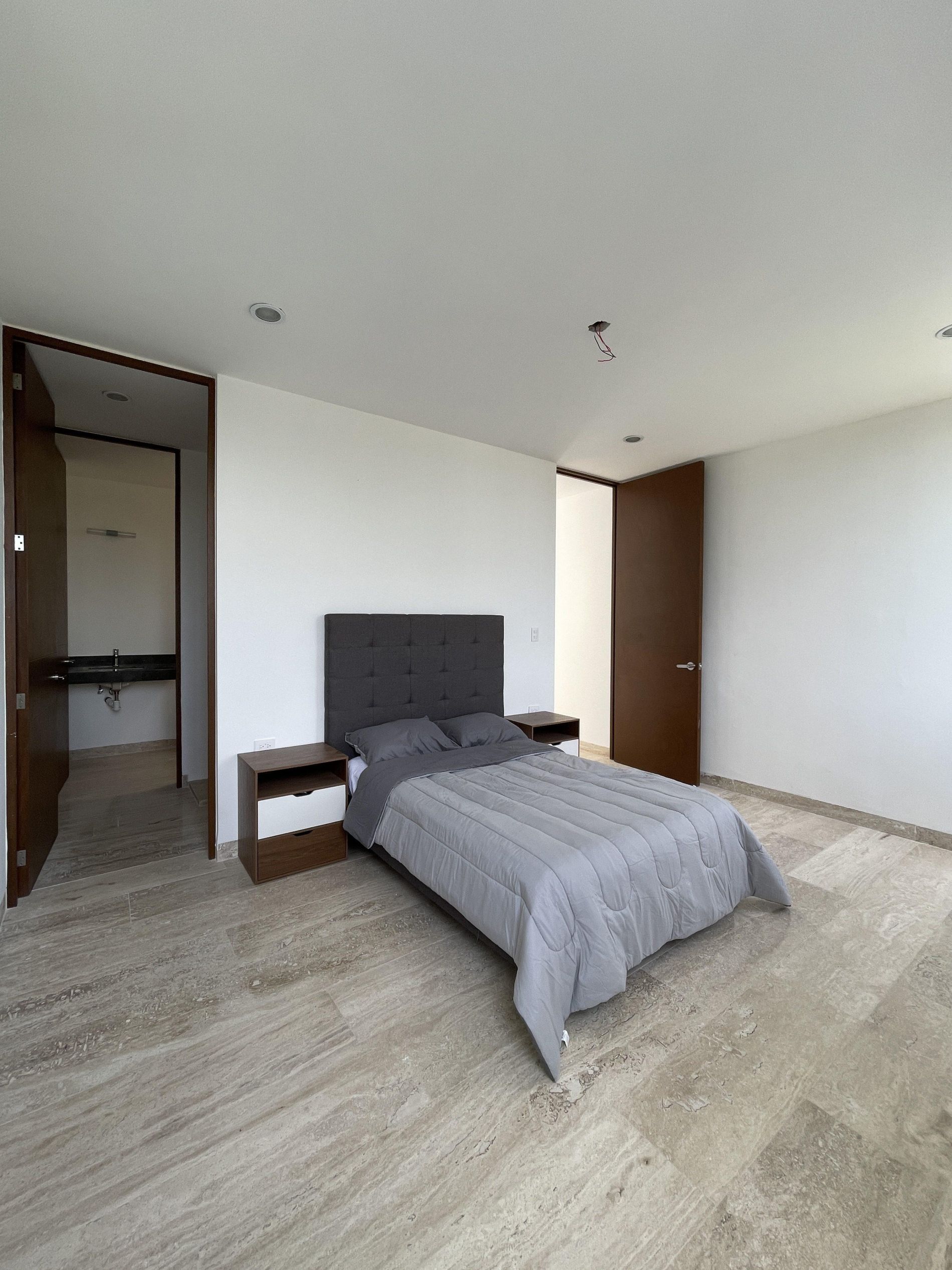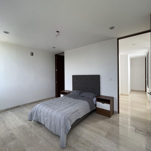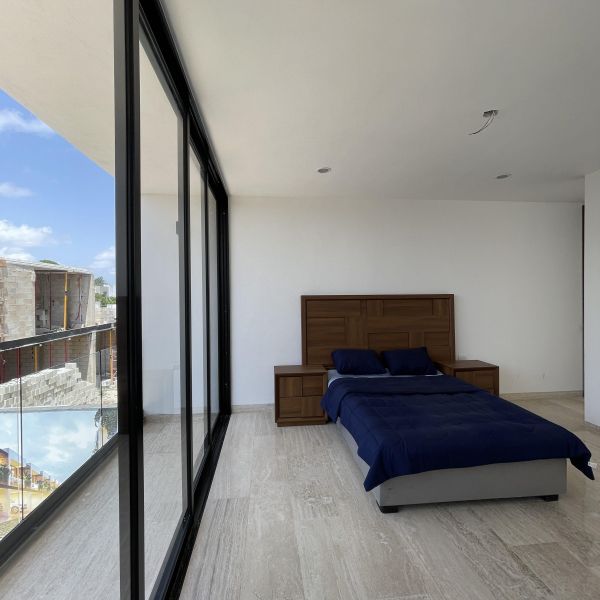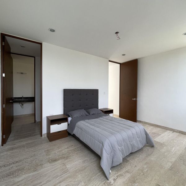 Recámara principal con área de clóset vestidor, baño completo con doble lavamanos y balcón