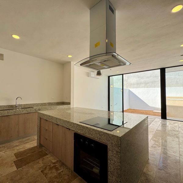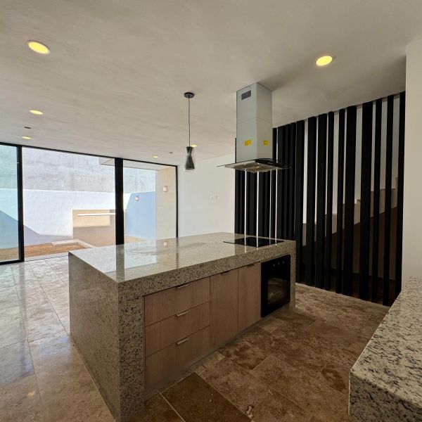 Cocina vestida, con isla desayunadora y parrilla eléctrica